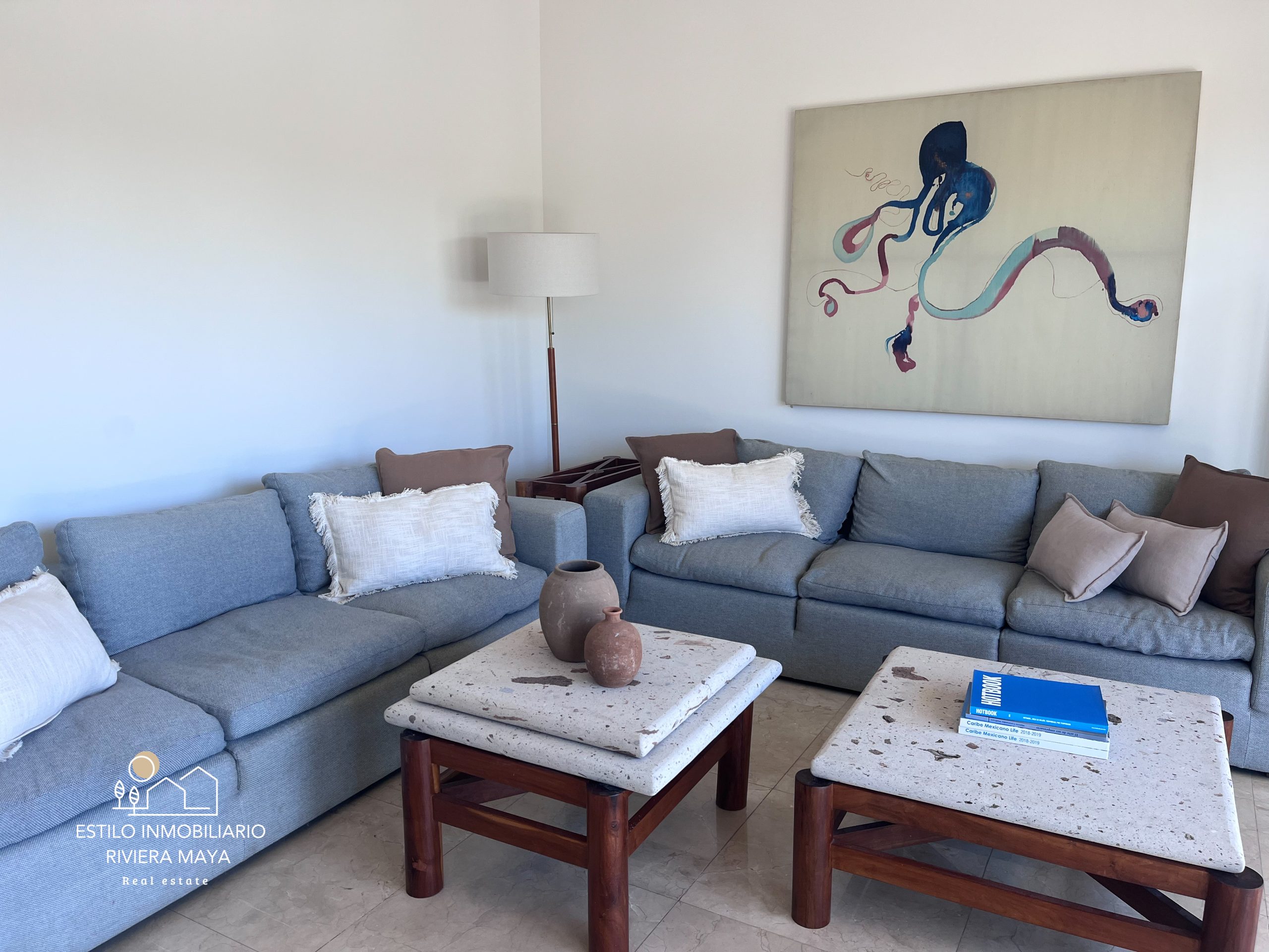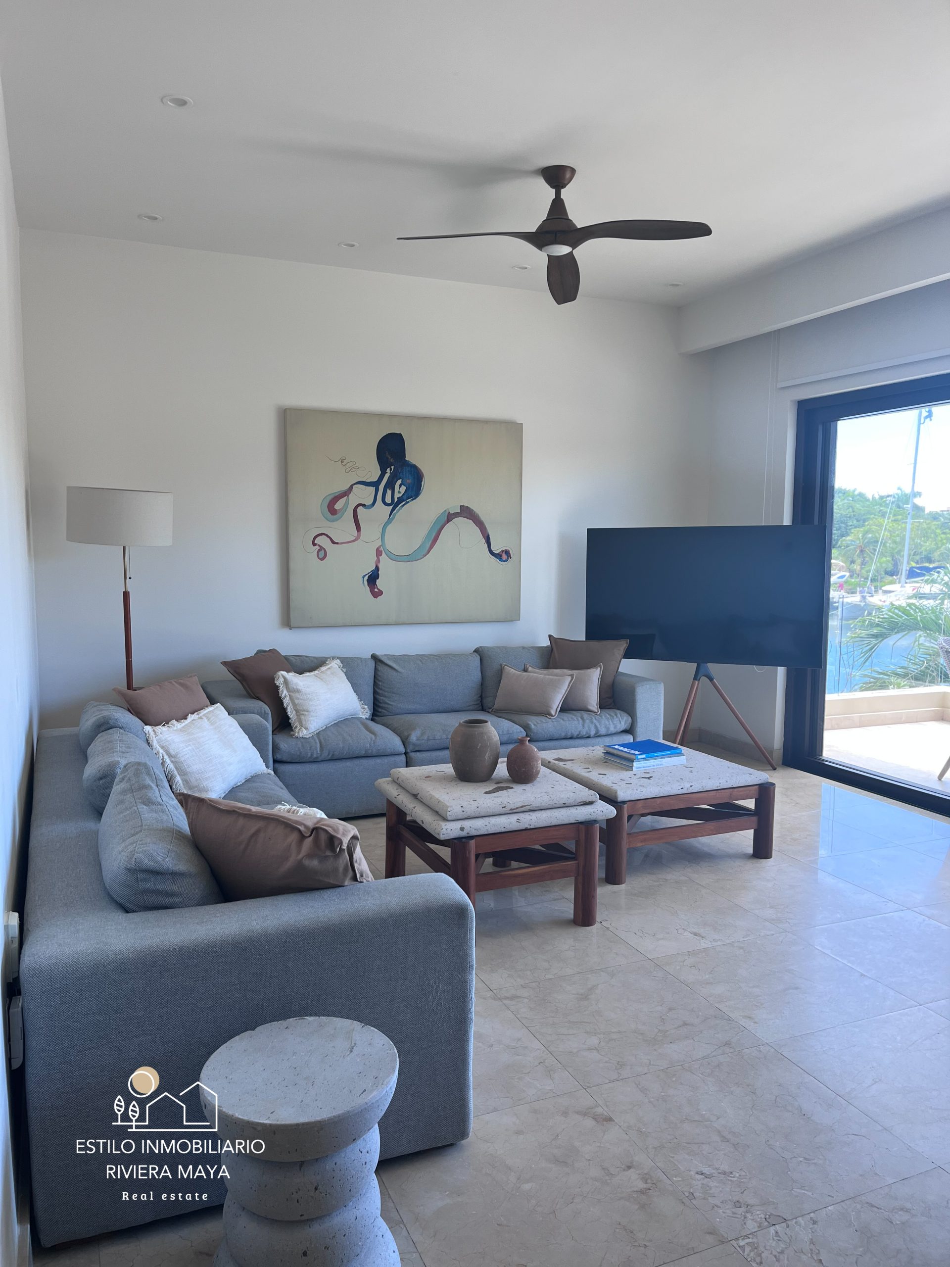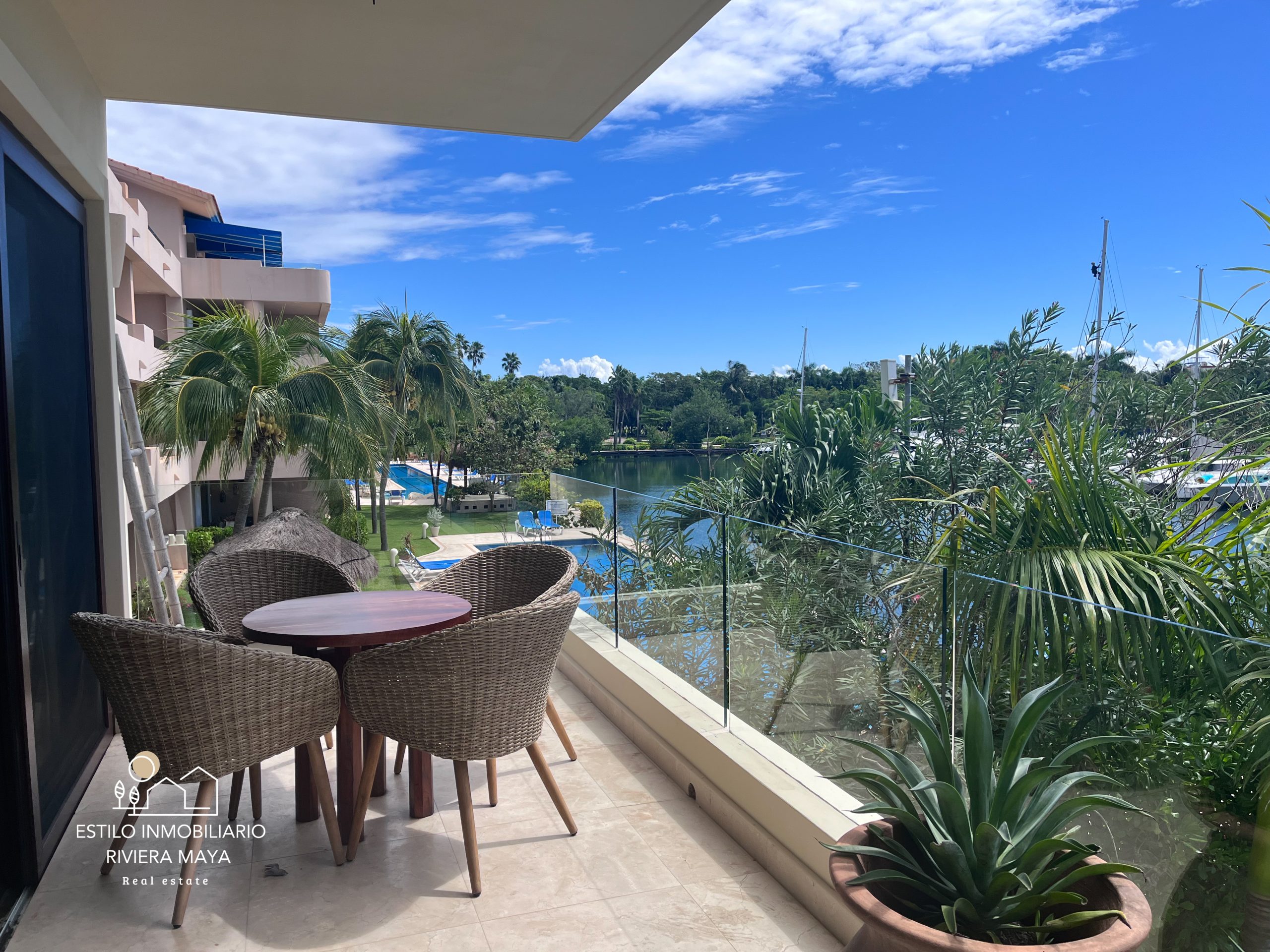 La propiedad se encuentra totalmente amueblada con un estilo moderno y decoraciones cuidadosamente seleccionadas. Cuenta con 3 habitaciones y 2.5 baños, amplios espacios de sala y comedor, y una terraza con vista directa a la marina, ideal para disfrutar del entorno náutico que distingue a Puerto Aventuras.